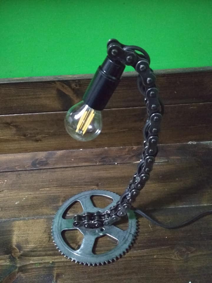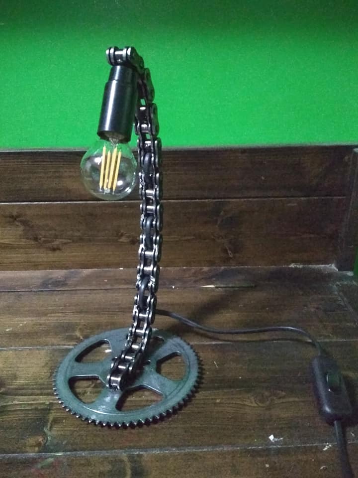 Lampada da scrivania realizzata con catena moto e corona , pezzo unico. industry - steampunk style -