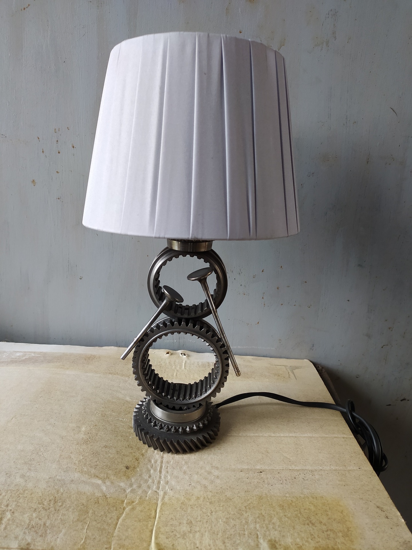 Lampada in stile industriale da notte sono fatte di vecchie parti di auto e moto, valvole e ingranaggi di trasmissione.